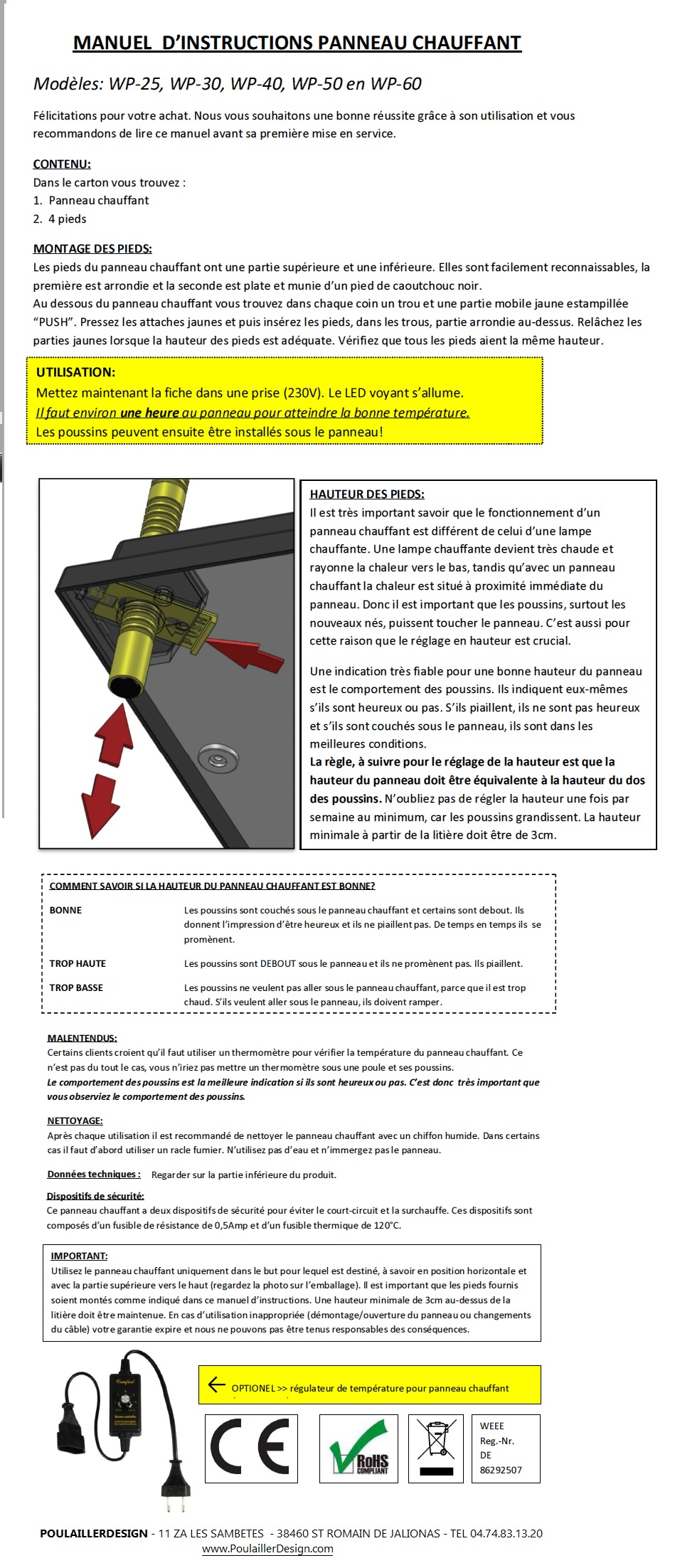 Pieds réglables en hauteur ce qui vous permet de l'adapter à la taille des poussins suivant leur croissance rapide. Vous pouvez aussi l'utiliser pour les canetons ou les petites cailles.