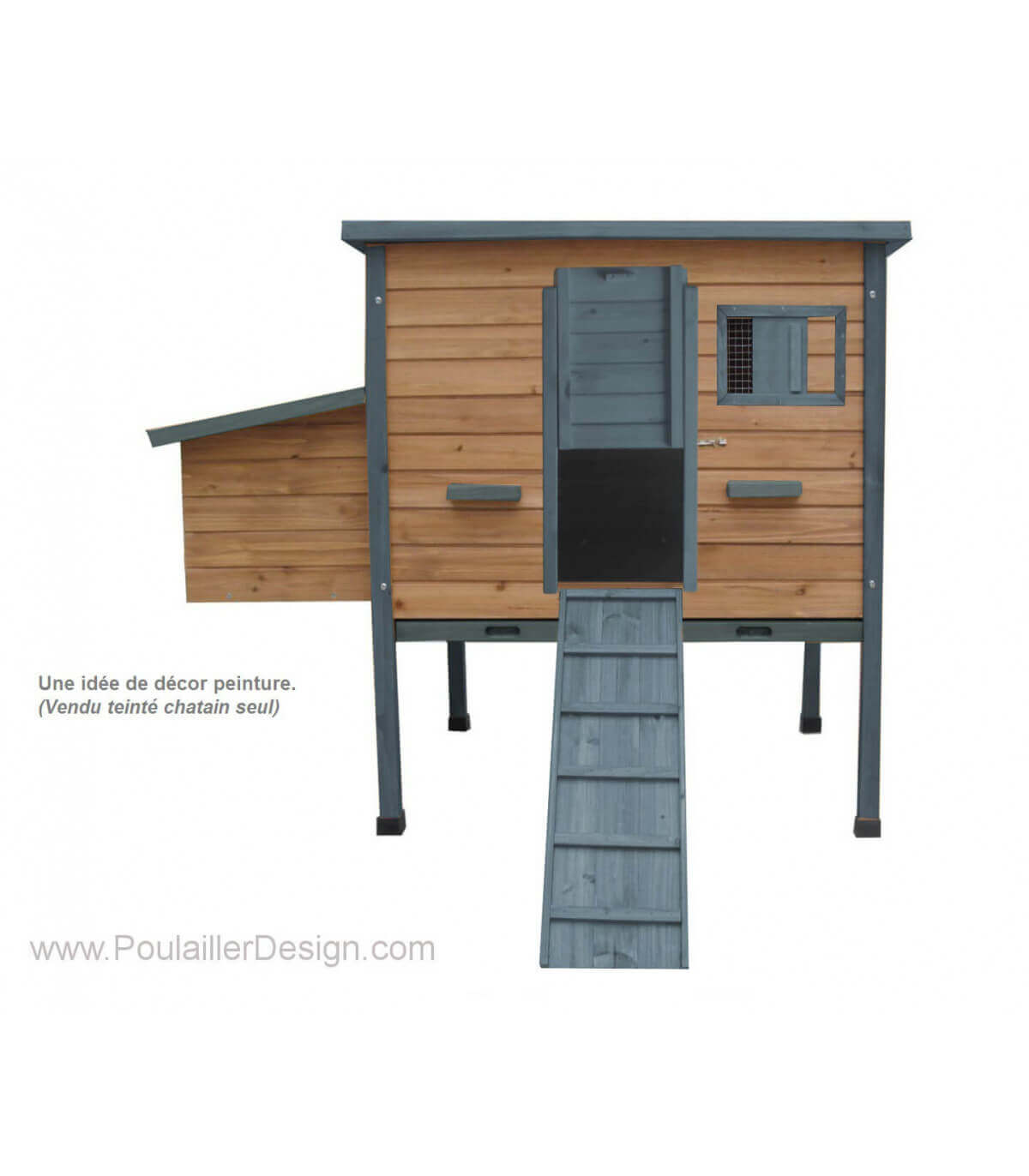 - Les pilotis costauds permettent aux poules de se cacher dessous en cas d'intempéries et de protéger mangeoire et abreuvoir de la pluie et de la vue des oiseaux.