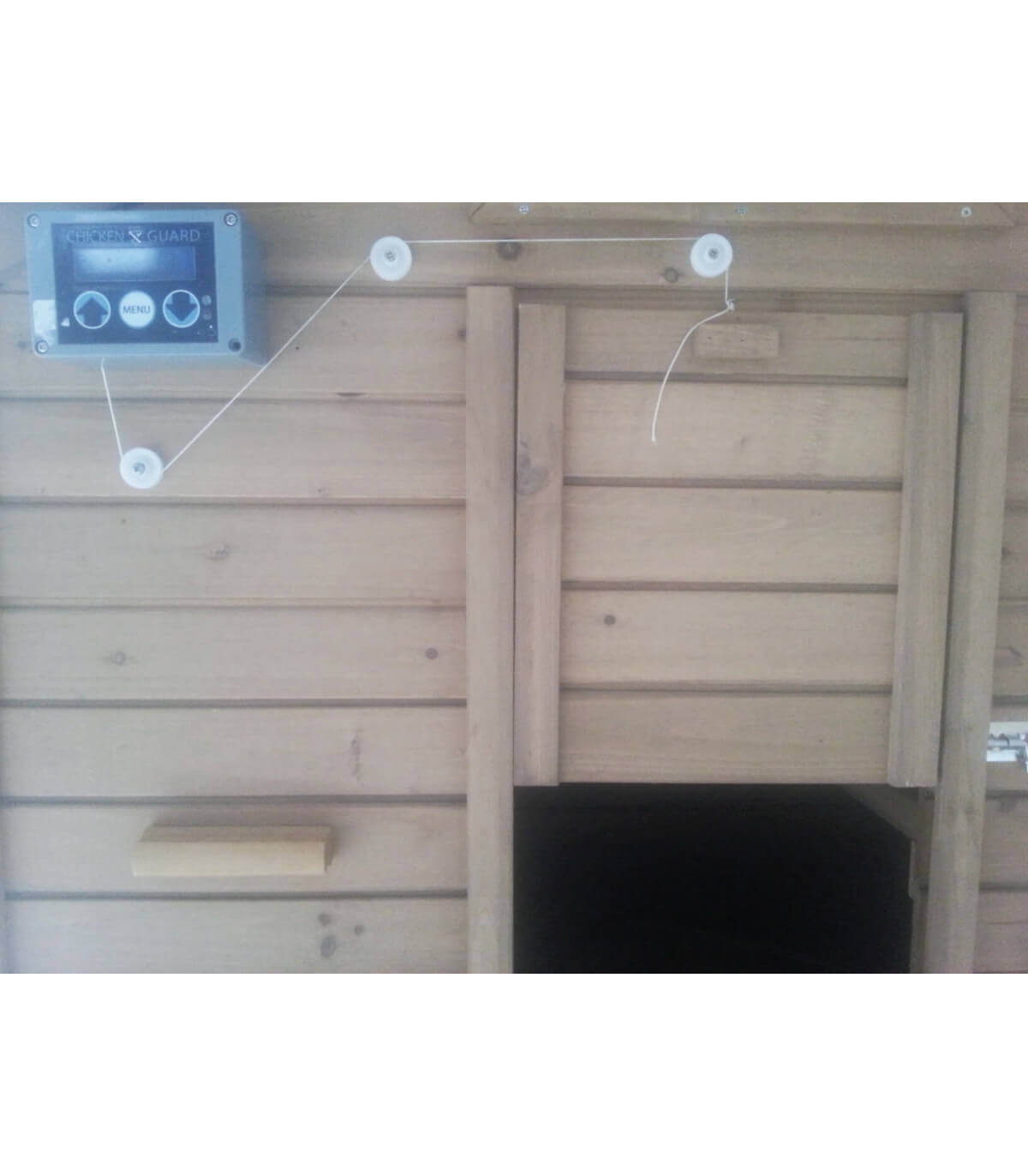 Voir les motorisations possibles, (choisir un "moteur seul" + 2 poulies) - Nettoyage facile : Tiroir à fientes mobile, accessible depuis l'avant (le poulailler ainsi adossable à un mur ou une haie) et sans avoir à se baisser, donc pas d'efforts.