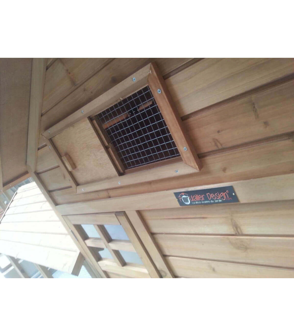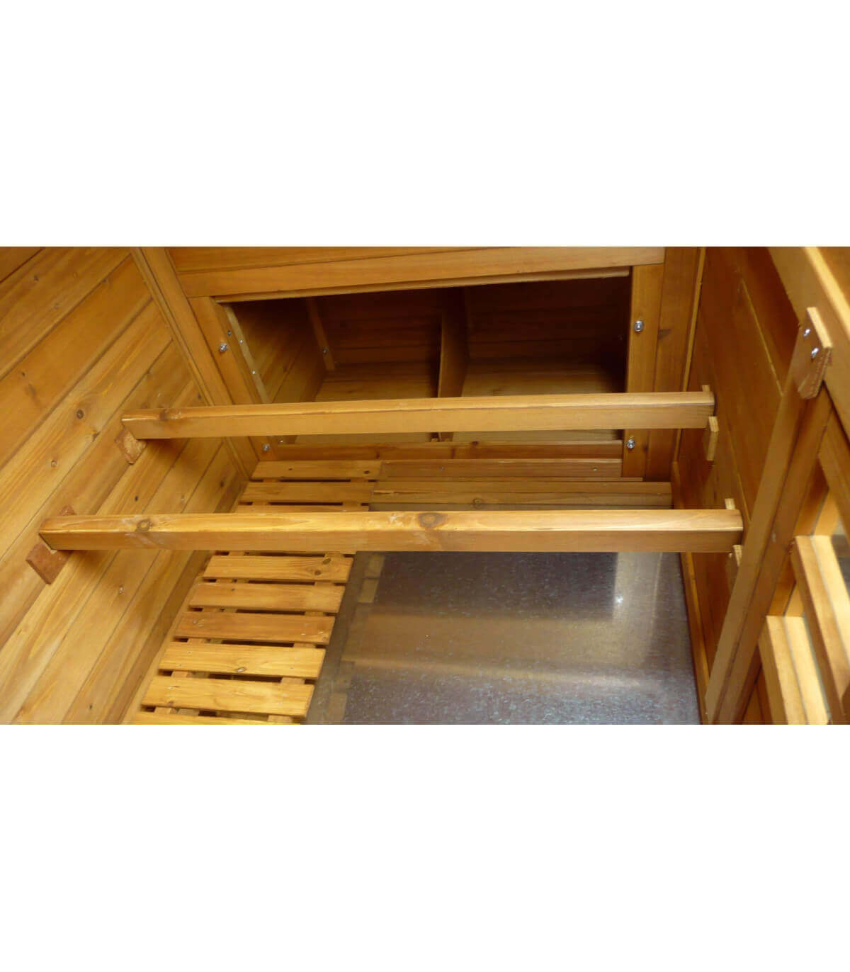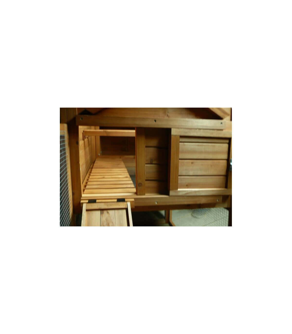 A l'intérieur, 2 perchoirs surélevés et 1 caillebotis.