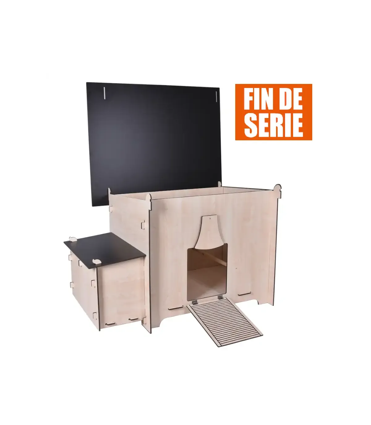 La trappe de fermeture se rabat façon pont-levis pour faire une rampe d'accès facile à grimper par toutes les races de poules et même les canards.